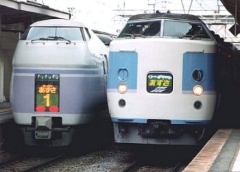 制御振り子搭載で、卵型の断面構造がユニーク 左がE351系「スーパーあずさ」 上諏訪 (撮影者:快速なのはな)